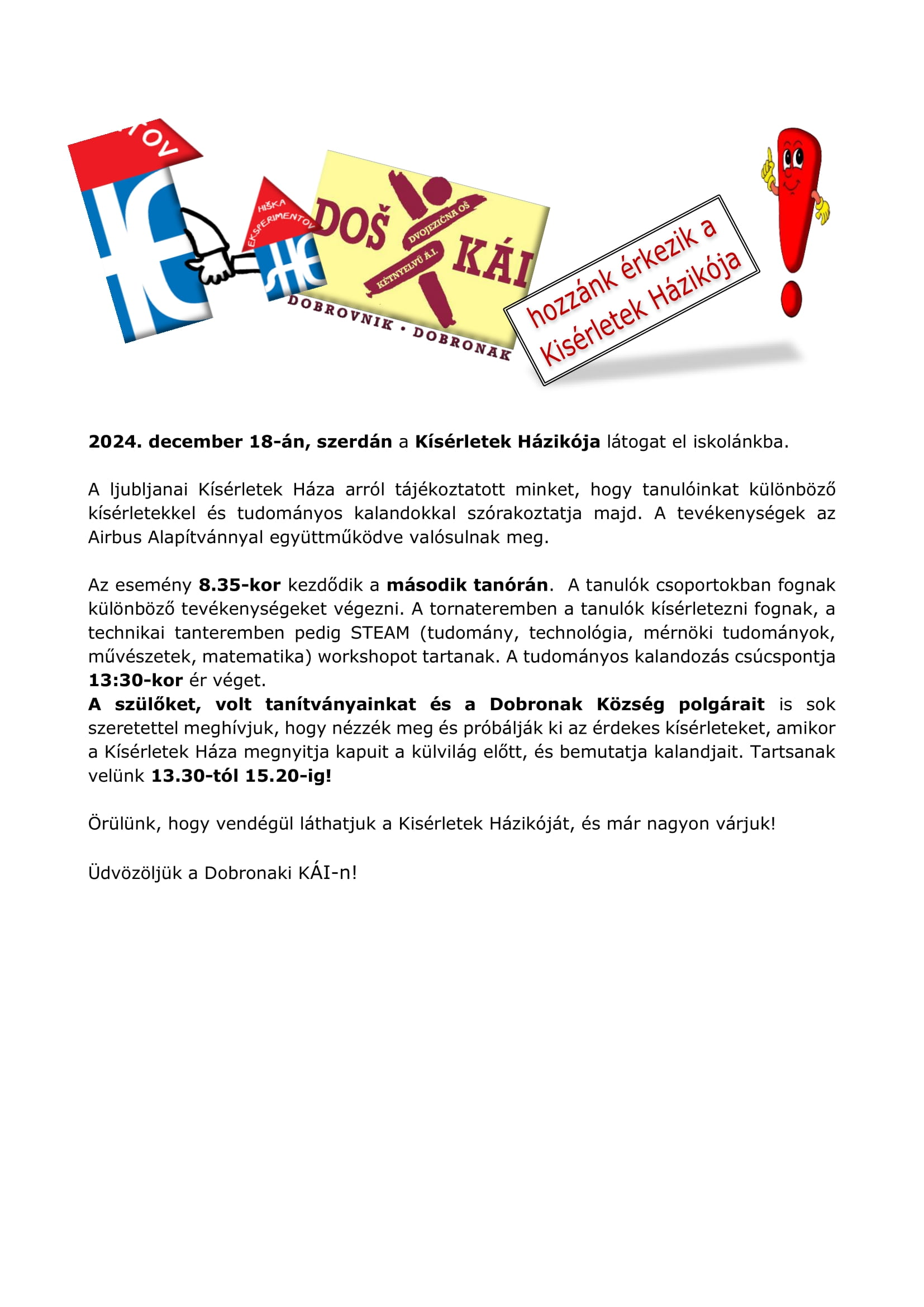 Na ogled in preizkus zanimivih eksperimentov vabimo tudi starše, naše bivše učence in ostale občane Občine Dobrovnik, ko bo Hiška eksperimentov odprla svoja vrata tudi izven in prikazala svoje dogodivščine. Pridružite se nam od 13.30 do 15.20 ure.