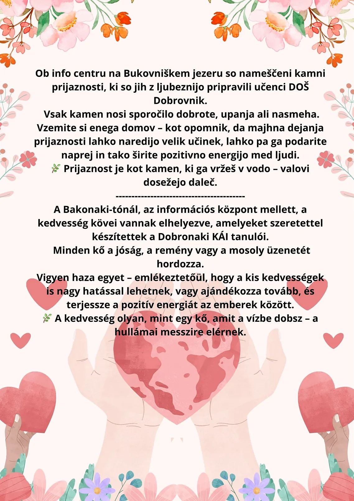 Kamni prijaznosti ob info centru na Bukovniškem jezeru.