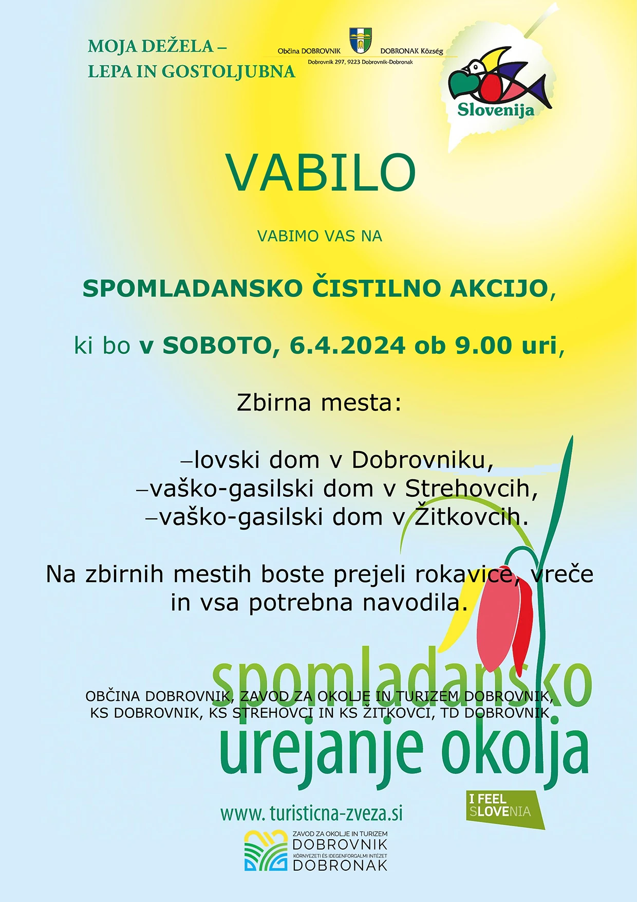 Vabljeni vsi ljubitelji čistega in lepega okolja, da se nam pridružite na vsakoletni spomladanski čistilni akciji v soboto, 6. aprila 2024 ob 9.00 uri na zbirnih mestih v občini Dobrovnik!